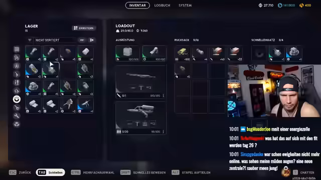 01:34:16Nach dem Sammeln von Gegenständen zeigt der Streamer sein Inventar und beginnt, Überschüsse zu verkaufen. Er ist verwirrt über die Funktion des Verkaufen-Buttons und stellt Fragen zu den gesammelten Ressourcen wie Munition oder Wachenteilen. Sein Inventar ist fast voll, was seine Sammlerleidenschaft zeigt.