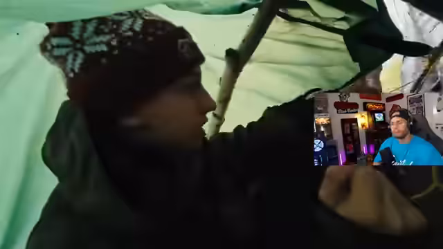 01:42:07Der Streamer entdeckt eine Plane und freut sich auf die Arbeit damit. Er findet einen weiteren schwarzen Koffer, der Wasserfilter enthält, und erinnert an die 3-3-Regel (drei Tage ohne Wasser, drei Wochen ohne Essen). Sie suchen nach essbaren Pflanzen und überlegen, wie sie ein Tarp als Shelter aufbauen können, um sich vor dem Regen zu schützen. Der Streamer erinnert sich an Stefans Lektionen über das Scouten und Feuermachen. Die Kette erweist sich beim Aufbau des Shelters als störend. Die Jacken der Teilnehmer sind präpariert und können dank Klettverschluss aufgerissen und ausgezogen werden, während T-Shirts und Thermounterwäsche nicht ausgezogen werden dürfen. Die Euphorie über das gelungene Shelter ist groß, obwohl die Kette weiterhin Probleme bereitet.