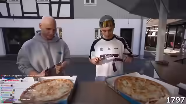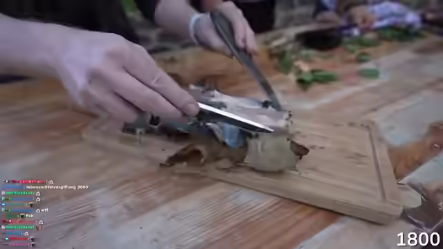 01:13:46Es wird über Pizza Hawaii diskutiert, wobei der Streamer seine Vorliebe dafür äußert. Es gibt Verwirrung um die bestellte Pizza, da Ananas fehlt. Ein Messer wird vorgestellt, das der Streamer von Joe Vogel geschenkt bekommen hat. Er besitzt insgesamt zehn Survival-Messer, die er wahrscheinlich nie alle benutzen wird. Das Messer wird als sehr scharf beschrieben und demonstriert, wie leicht es schneidet. Lukas ist für die Kameraführung zuständig, was zu Problemen führt. Eine Biene taucht auf, und der Streamer, der allergisch ist, sorgt sich um einen möglichen Stich. Er hat jedoch ein Notfall-Kit dabei.