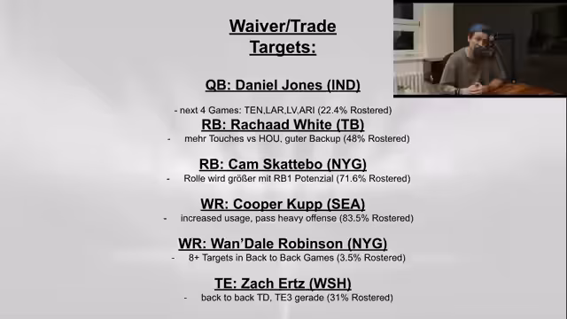 00:06:24Es wird sich darauf gefreut, die Fantasy Woche 2 zu besprechen, die viele interessante Spiele bot. Einige Teilnehmer hatten Pech, während andere, wie Sabri, herausragende Leistungen zeigten und als Favorit in der Liga gelten. Die Performance und der Aufbau seines Teams sind beeindruckend. Es wird nachgefragt, wie die Fantasy-Ergebnisse der Zuschauer in dieser Woche aussahen, ob sie gewonnen oder verloren haben und welche Spieler die richtige Entscheidung waren. Die Seahawks haben trotz hoher Punktzahl verloren, was auf einen starken Gegner hindeutet. Amon Ra wurde als Spieler hervorgehoben, der zum Sieg verholfen hat. Es wird empfohlen, Swift im Tausch zu bekommen, da er einen soliden Running Back mit besserem Fantasy-Wert als Jenty darstellt. Goff wird als sehr solide angesehen, und es wird geraten, nicht gierig zu werden, wenn Mahomes gut spielt. Es wird empfohlen, mit Fantasy-Lineups bis Donnerstag zu warten, um Verletzungsberichte zu berücksichtigen. Der Ausfall von Kalajah Kenzi wird als großer Verlust für die Buccaneers hervorgehoben. Es wird empfohlen, Hawkinson zu droppen, da er keine Produktion zeigt, und stattdessen Jawan Johnson zu holen. Jordan Love spielt guten Football und bietet Upside, während Kyler Murray Rushing Yards bietet. Caleb und May bieten hohes Risiko und Upside, während Bo Nix und Jordan Love als sicherere Optionen gelten.