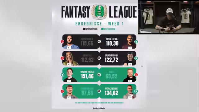 00:12:53Der Streamer analysiert die Ergebnisse der Fantasy-Liga, beginnend mit dem überraschenden Upset von Kasim Edebali gegen Björn Werner (118,38 zu 115,66). Er erläutert, dass Björn zwar auf der Quarterback- und Running-Back-Position punktete, Kasim jedoch durch seine Wide Receiver und die Broncos-Defense gewann. Kasims tiefes Roster wird hervorgehoben, während Björn eine stärkere Receiver-Leistung benötigt. Im zweiten Spiel gewann Splash Bruder gegen Mika Kaul (122,72 zu 112,92), wobei Sabris Entscheidung für Patrick Mahomes und Travis Casey sich auszahlte. Mika punktete zwar solide, aber Sabri übertraf ihn bei Kicker und Defense. Der Streamer erwähnt Trades von Travis Etienne. Anschließend bespricht er die "Klatsche der Woche", wo er Hansi, seinem Podcast-Partner, mit 151,46 zu 69,52 besiegte. Er betont die schwache Leistung von Hansis Team, insbesondere Xavier Worthy, Jamar Chase, AJ Brown und der Steelers Defense. Der Streamer analysiert seine eigene Aufstellung, die von Josh Allen, Christian McCaffrey und Saquon Barkley angeführt wurde, und lobt Garrett Wilson für seine Leistung.
