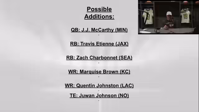 01:09:07Die Performance von McLaurin und A.J. Brown wird bewertet, wobei keine Panik bei McLaurin aufkommen soll. Der Einfluss von Saquon Barkley auf die Eagles-Offensive wird hervorgehoben, was dazu führt, dass Jalen Hurts weniger Risiko bei Pässen eingeht. Hurts' Fokus liegt auf dem Gewinnen des Spiels, nicht auf individuellen Statistiken. A.J. Brown ist eine solide Fantasy-Option, aber ein Trade könnte in Betracht gezogen werden, wenn man einen guten Gegenwert erhält. Bonix hatte Schwierigkeiten, aber es wird erwartet, dass er sich erholt. Ein möglicher Trade von Tyreek Hill zu den Chiefs wird diskutiert. Njoku wird Fennin Jr. vorgezogen, da er von Joe Flecko bevorzugt wird. Ein Trade von Pickens gegen Brown oder Johnston wird aufgrund der bereits vorhandenen Receiver abgelehnt. Der Gewinn in einer Liga, in der der Draft gestreamt wurde, wird erwähnt. Zach Ertz wird als Tight End in einer Liga ausgewählt. Ein Trade von Pickens gegen Marquise Brown wird abgelehnt, da Pickens als wertvolleres Asset angesehen wird. Es wird empfohlen, Aaron Jones gegen Etienne zu tauschen oder Aaron Jones und Kenneth Walker für einen Spieler wie David Montgomery abzugeben. Ekpuka wird als sehr gute Fantasy-Option für die Zukunft eingeschätzt.