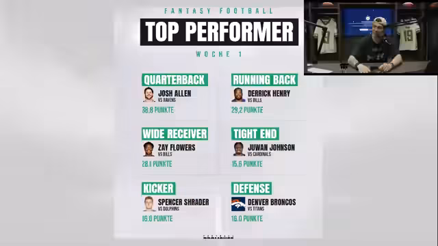 00:05:21Der Streamer begrüßt die Zuschauer und freut sich über seinen ersten 1-0 Start in einer Fantasy-Liga. Er betont, wie wild die erste Woche in der NFL war, insbesondere die Primetime-Spiele wie Lamar Jackson gegen Josh Allen. Er fragt die Zuschauer nach ihren Eindrücken und Lieblingsspielen der Woche. Der Streamer lobt JJ McCarthy und seine Leistung, besonders die drei Touchdowns im vierten Quarter. Er hebt hervor, dass McCarthy ein Jahr hinter Sam Donald gelernt hat und nun fehlerfreien Football spielt. Der Streamer lobt Vikings-Coach Kevin O'Connell für seine Arbeit mit McCarthy und der Offensive, indem er McCarthy die Schlüssel zu einem Ferrari gibt. Er betont, dass McCarthy sich von Woche zu Woche steigern kann, was die Saison sehr interessant machen würde. Er geht auf die Topscorer der Woche ein, darunter Josh Allen mit 38,8 Fantasy-Punkten, Derrick Henry mit 29,2 Punkten und Zay Flowers mit 28,1 Punkten. Er erwähnt auch Jawan Johnson, Spencer Schrader und die Denver Broncos Defense als Top-Performer. Abschließend äußert er sich beeindruckt von Josh Allen und seinem Comeback im vierten Quarter und kündigt an, auf Fantasy-Optionen und Zuschauerfragen einzugehen.