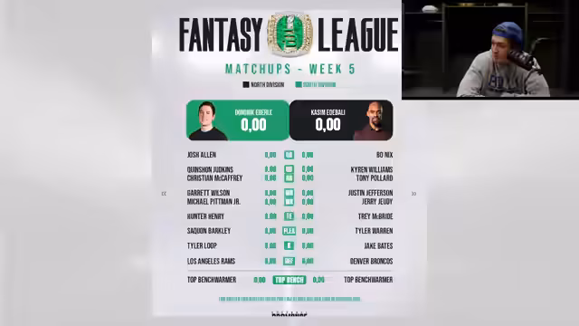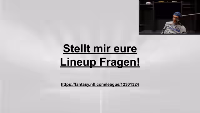 00:17:10Der Streamer geht auf verschiedene Fantasy-Liga-Duelle ein, wie Björn gegen Patrick, Splashbruder gegen Robin und Mika gegen Hansi. Es wird auf die aktuellen Tabellenstände und die Performance der Teams eingegangen. Auch werden einige Spieler wie Kevin Zeitler, Justin Jefferson und CeeDee Lamb angesprochen, wobei Verletzungen und ihre Auswirkungen auf Fantasy-Performance diskutiert werden.