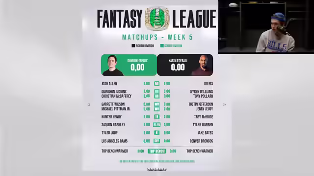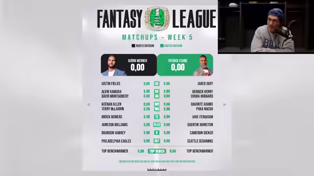 00:16:27Der Streamer beginnt mit der Woche 5 Preview und bespricht die verschiedenen Fantasy-Matchups. Björn Werner (0-4) spielt gegen Patrick Gesume, was zu Trashtalk führen könnte, falls Björn verliert. Splash-Bruder gegen Robin und Mika gegen Hansi sind weitere Duelle, wobei Mika viel Pech mit Verletzungen hat. Der Streamer spielt selbst gegen Kasim, was ein enges Matchup werden soll. Er analysiert die Teams der einzelnen Duelle, einschließlich Quarterbacks, Running Backs und Receiver. Es werden auch Verletzungen und mögliche Strategien der Teams diskutiert. Der Fokus liegt auf den Fantasy-Aspekten der NFL-Spiele und wie man seine Aufstellung optimal gestaltet.