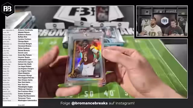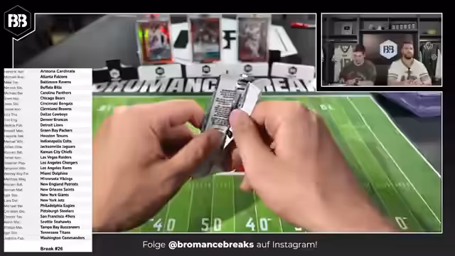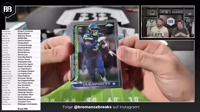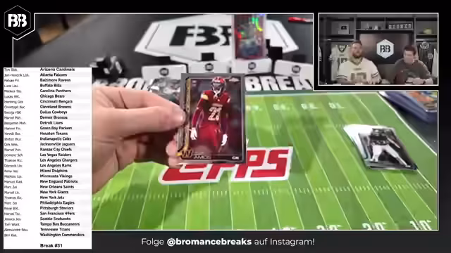 03:22:20Es wird über Break 31 gesprochen, das abwechslungsreich sein sollte. Der Streamer wünscht allen Good luck. Die Teams werden verteilt: Cardinals, Falcons, Ravens, Bengals, Chiefs, Rams, Patriots, Giants, Seahawks. Es wird gefragt, ob die Fans alles lesen können. Es wird eine Dante Thornton-Karte gezogen, die normalerweise ein Toploader unter den Zählern ist.