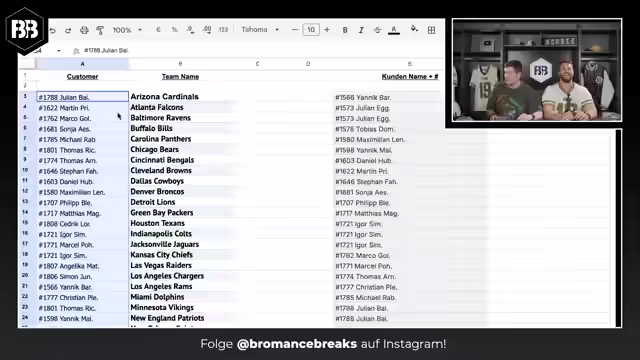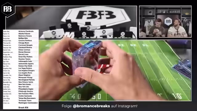 04:23:20Die letzten vier Breaks werden organisiert, wobei Break 39 und 40 abwechselnd von den Moderatoren bearbeitet werden. Zuvor werden die Teams für die Breaks Randomisiert, um Fairness zu gewährleisten. Igor zeigt sich als besonders aktiver Käufer und sicherte sich die Buccaneers, Giants, Patriots, Chiefs, Packers und Broncos. Die Zuteilung der Teams wird im Chat kommuniziert, um Transparenz zu schaffen. Dies schafft eine strukturierte Vorgehensweise für die verbleibenden Breaks.