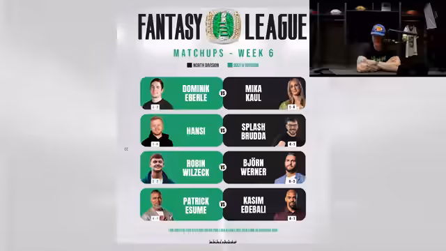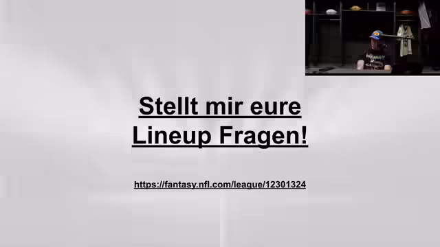 00:16:06Der Fokus liegt auf den direkten Duelle innerhalb der eigenen Fantasy-Liga. Spiele wie Mika vs. Streamer, Hansi vs. Sabri, Robin vs. Björn und Patrick vs. Kassim werden detailliert besprochen. Die Team-Zusammensetzungen werden analysiert, wobei Sonderfälle wie Björns Trade für drei neue Starter (Travis Etienne, DK Metcalf, Michael Pittman Jr.) nach einer schwachen Saison von 0-6 hervorgehoben werden, um sein Team zu revitalisieren.