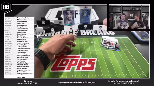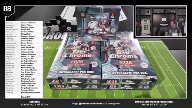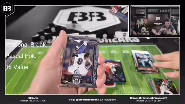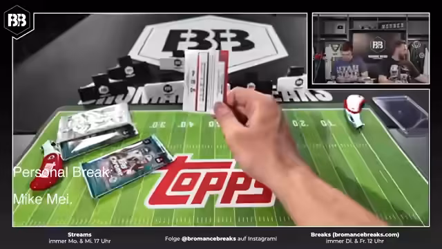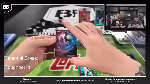 00:52:01Bei der Eröffnung der NFL Topps Chrome Boxen wird erwähnt, dass dies bereits der vierte Break ist und überraschend schnell ausverkauft wurde. Dies unterstreicht die hohe Nachfrage nach NFL-Sammelkarten im deutschen Markt. Während des Streams treten mehrfach technische Probleme auf, darunter ein 'Frozen' der Kamera und der Omni-Pocket, die mehrfach neu gestartet werden müssen. Streamer äußern Verärgerung über die wiederholten Ausfälle, während das Team versucht, die Probleme schnell zu beheben, um mit der Öffnung der Boxen fortfahren zu können.
