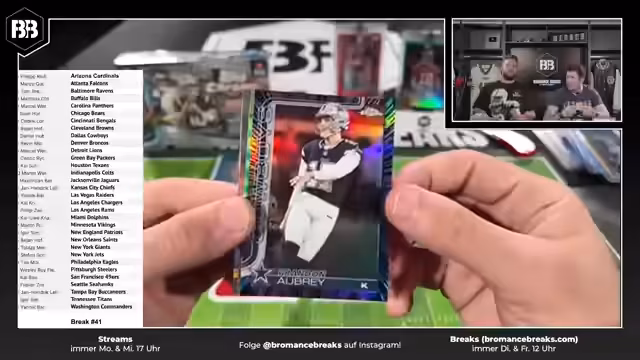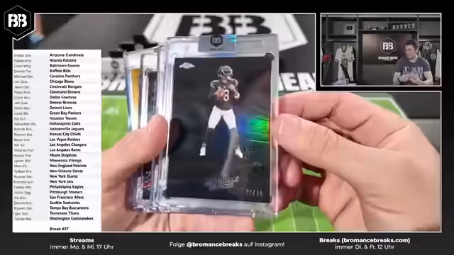 01:00:58Break Nummer 38 wird vorbereitet, um den Breaker Björn direkt reinkommen zu lassen. Die Teamliste für den Break wird präsentiert und als zweite Hälfte der Cakes beschrieben. Es werden sechs schöne Boxen für die Zuschauer geöffnet. Der Prozess des Breakens erfolgt fair transparent, wobei die Teamauswahl und die Zuordnung der Karten im Fokus stehen. Besondere Aufmerksamkeit wird auf die wertvollen Karten wie Caleb Williams-Karte gelenkt, die als persönliche Favoriten des Streamers gilt. Die Begleitung durch ein Technik-Team gewährleistet einen reibungslosen Ablauf des Streams.