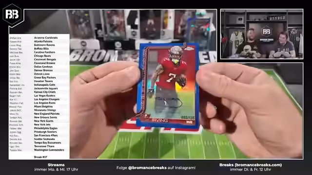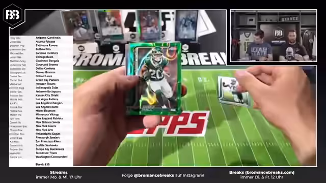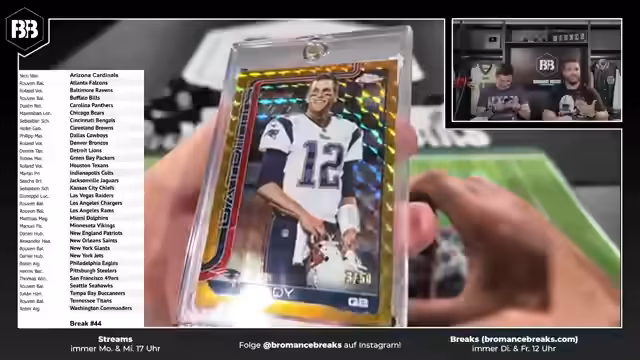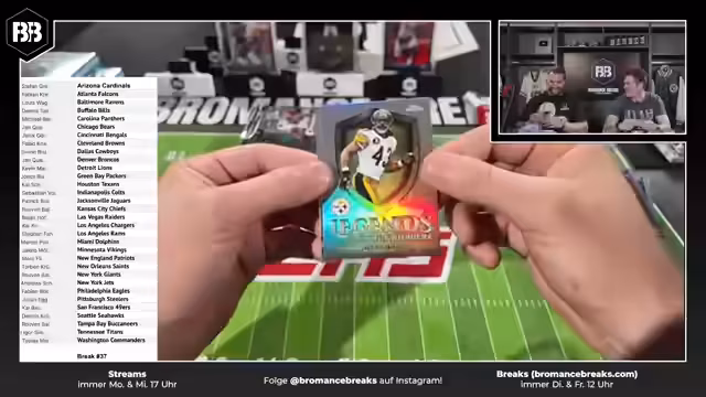 00:07:51Der Stream beginnt mit dem ersten Break, bei dem die Karten zufällig den Teams zugeordnet werden. Beim Öffnen der ersten Boxen gibt es bereits einige Hits, darunter mehrere schwarze Parallelautos und ein Fallhit. Die Streamer zeigen verschiedene Karten und geben Informationen zu deren Seltenheit und Wert. Sie betonen, dass sie versuchen, faire Preise zu halten und auf dem deutschen Markt einen großen Bestand an NFL-Artikeln zu haben.