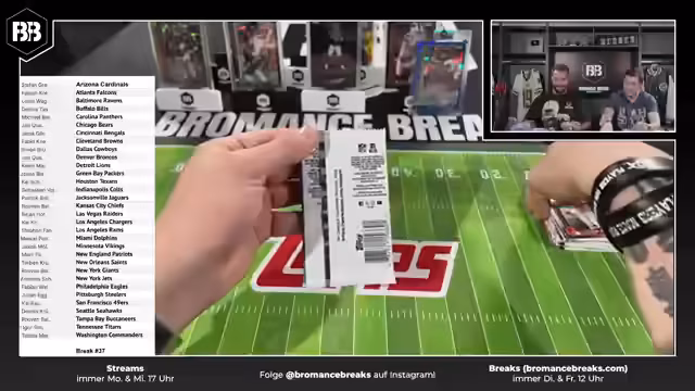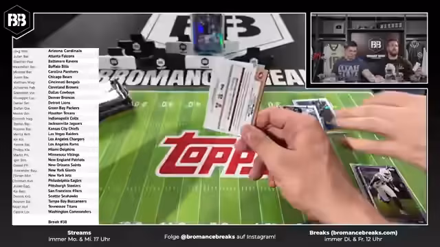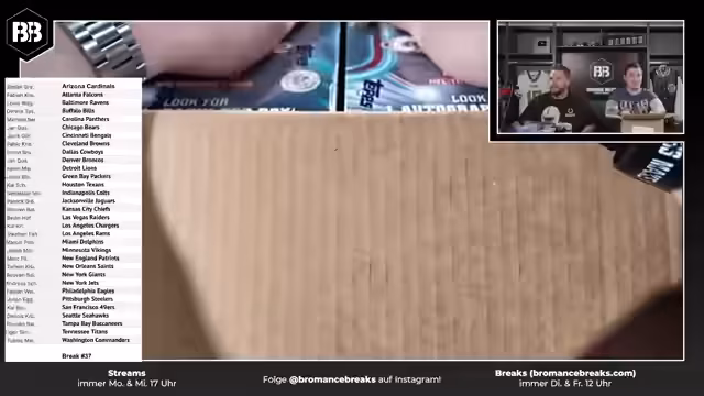 02:51:57Nach einer einstündigen Unterbrechung wegen technischer Probleme ist der Stream zurück. Die Streamer drücken die Daumen, dass nun alles reibungslos läuft. Sie setzen ihre NFL Topps Chrome Boxen Breaks fort und haben bereits einige Hits gezogen, darunter Josh Allen, Case Hits mit Caleb Williams und weitere Autos.
