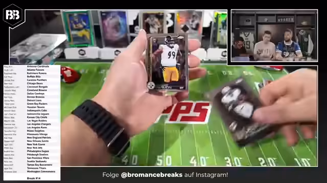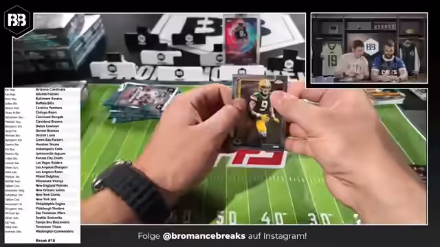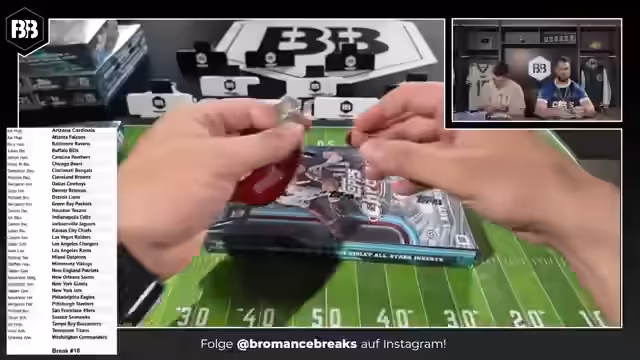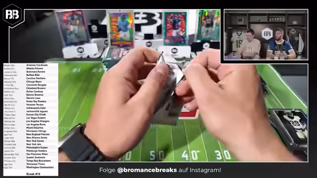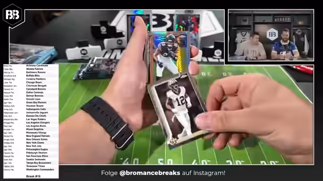 00:25:46Mit dem 'Open for Business' beginnt das Team mit dem Break 14, einem 6-Box-Mixer. Die Teams werden abwechselnd ausgewählt und die Karten werden sofort präsentiert. Die erste Karte ist ein Autogramm von Rookie Shamar Stewart für die Bengals. Es werden verschiedene Kartenarten erklärt, darunter nummerierte Karten, Radiating Rookies und die Seltenheit von Karten wie der One of One. Die Karten werden aufwändig im Sleeve und im Hard Case gelagert. Es wird gezeigt, dass bereits in den ersten Boxen hochwertige Karten gezogen wurden.