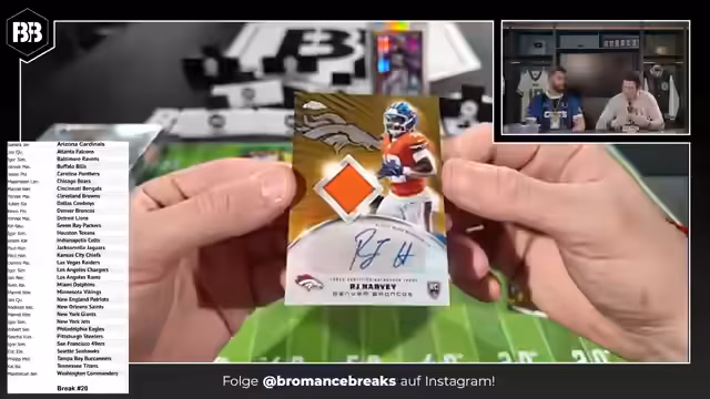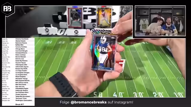 01:17:29Nach Abschluss des ersten Box Breaks wird ein Recap der wichtigsten Karten gegeben, darunter Derrick Henry Genie, Tyler Warren Auto-Graph und Travis Etienne zu 10. Zudem werden die nächsten Breaks angekündigt und Informationen zur Durchführung und Teilnahme gegeben. Dabei wird unterschieden zwischen Pick Your Team und Random Team Breaks, sowie zwischen verschiedenen Box-Größen und deren Inhalt.