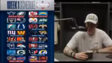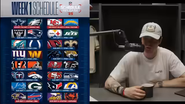 00:56:43Nachdem alle Fantasy-Teams der Football-Bromance-Liga analysiert wurden, richtet sich der Fokus auf den ersten Spieltag der NFL. Der Streamer beginnt, die einzelnen Spiele der Woche durchzugehen und gibt erste Einschätzungen zu möglichen Performern und Startaufstellungen. Im Spiel zwischen den Cowboys und den Eagles werden sowohl die Stärken der Offensive der Cowboys als auch die Titelaspirationen der Eagles erwähnt. Der Fokus liegt darauf, welche Spieler der jeweiligen Teams in Woche 1 besonders gute Chancen haben, statistisch hervorzustechen und was für die Fantasy-Spieler beachtet werden sollte. Dies leitet die finale Phase des Streams ein, die sich auf die direkten Ausblicke für den Spieltag konzentriert.