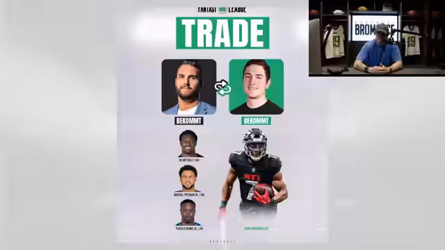 00:24:27Ausgehend von der schwachen Situation von Björn (0-5, Verletzungen, Kadertiefe) schlägt der Streamer einen Trade vor. Er bietet Travis Etienne als Hauptgegenwert für Bijan Robinson an, um Björns Receiver-Corps zu stärken, das derzeit aus zweitklassigen Spielern besteht. Obwohl der Streamer mit Travis Etienne sein größtes Asset abgibt, argumentiert er, dass Björn mit dem Trade die Breite seines Teams deutlich verbessert und damit seine Siegchancen maximiert. Die Gegenspieler wie Mika und Sabri ärgern sich über die fairen, aber für sie nachteiligen Konditionen. Für den Streamer bedeutet der Deal, dass er seine Running-Back- und Flex-Positionen für die restliche Saison fest etabliert hat und sich selbst als 'Winner' des Trades sieht.