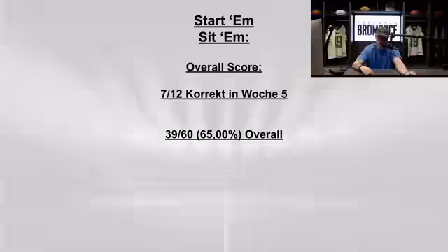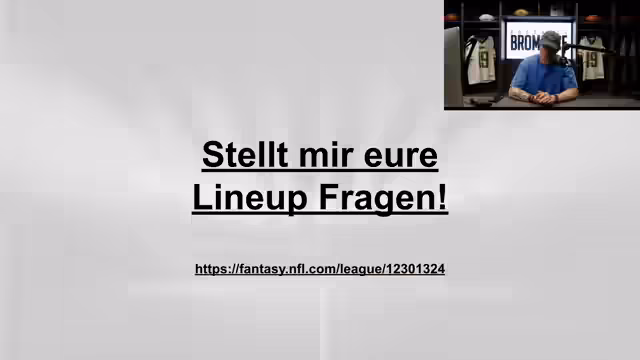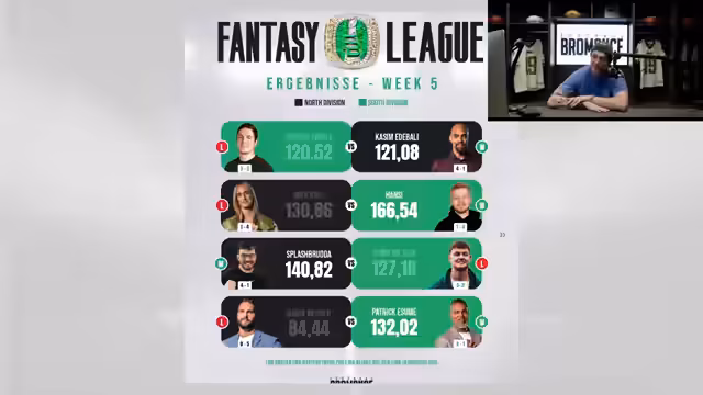 00:11:08Der Streamer präsentiert detailliert den aktuellen Stand seiner Fantasy-Liga. Während sich Patrick souverän auf 4-1 verbesserte und Björn mit einem brutalen Ergebnis von 84,44 zu 132,02 Punkten verlor, steht der Streamer selbst bei 3-2. Er analysiert seine eigene Liga, in der er in jeder 3-2 steht und sich in einer soliden Anfangsphase der Saison wähnt. Sein Frust galt dem Receiver AJ Brown, der trotz hoher Draft-Position nicht performt, und Jamal Chase, der auf der Bank saß und eine Top-Leistung zeigte. Die Kombination aus Pech bei der Aufstellung (AJ Brown) und einem Ausfall (Rams-Defensive) verursachte knappe Niederlagen. Gleichzeitig wurde die extrem schwache Performance von Björn (0-5, wenigste Punkte) und der dominierende Sieg von Patrick diskutiert, der sich primär auf die starke Leistung von Jake Ferguson und seine Running-Backs stützte.