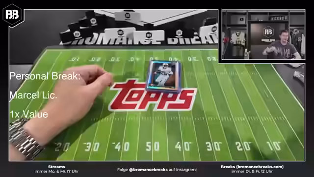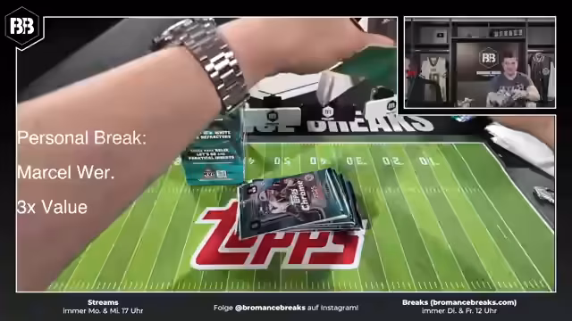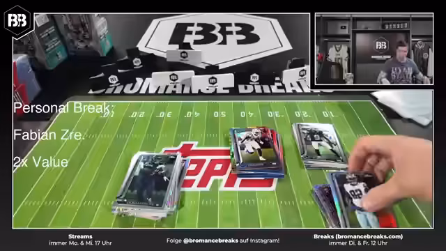 00:00:00Der Stream startet um 1:30 Uhr an einem Montag. Die Streamer diskutieren über die langen Streams und die Freude daran, über alles reden und Karten zu genießen. Es gibt technische Probleme mit dem Internet und Twitch. Der Streamer zeigt, wie er Karten sortiert und top loadet, und erklärt die Vor- und Nachteile davon. Die Eröffnung der NFL Topps Chrome Boxen beginnt, mit Fokus auf die Suche nach Autogrammen und seltenen Karten.