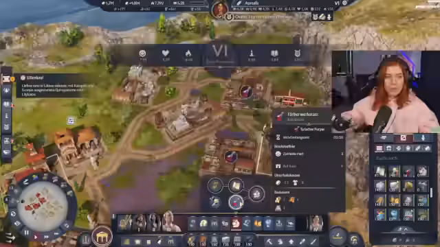 05:42:40Die Stadtplanung in Albion wird gelobt, insbesondere die Integration von Grünflächen. Die Zufriedenheit der Bewohner ist hoch, und es wird überlegt, die Streitwagenproduktion zu starten. Es wird festgestellt, dass ein neues Schiff für den Transport benötigt wird. Die Idee eines doppelten Brunnens wird als gute Idee hervorgehoben. Die Kultur in der Stadt soll gesteigert werden, wofür weitere Bewohner aufsteigen müssen. Der Bau des Kolosseums verbraucht viele Materialien, insbesondere Beton, was zu Verzögerungen führt. Es wird bemerkt, dass Streamlabs verspätet Alerts liefert. Die Empfehlung, Anno 117 auch für Anfänger zu spielen, wird ausgesprochen, da das Tutorial und die Kampagne einen guten Einstieg bieten. Die Lernkurve wird als steil, aber lohnenswert beschrieben.