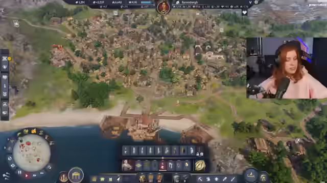 00:08:47Nach einer kurzen Orientierung in der Stadt Albion wird der Fortschritt im Spiel begutachtet. Der Ältestenrat wurde gebaut, und die Produktion von Umhängen wurde gestartet, wobei festgestellt wird, dass diese noch nicht vollständig angelaufen ist. Es wird überlegt, die Produktion zu verdoppeln, da sowohl Albion als auch Latium die Umhänge benötigen. Der Plan, die Stadt über den Fluss hinaus zu erweitern und weitere Brücken zu bauen, um einen zweiten Stadtteil mit einem Kolosseum in der Mitte zu schaffen, wird rekapituliert. Als nächste Produktionskette stehen Fellmützen an, die Salzkraut und Biber benötigen. Salzkraut ist bereits in Produktion, aber eine dritte Insel mit Biberpopulation muss noch annektiert werden. Eine geeignete Insel wird identifiziert, die auch Vögel als Ressource bietet. Die Überlegung, ein Depot zu bauen, wird verworfen, da die Insel als nicht so relevant eingestuft wird. Die Spielzeit beträgt bisher 65 Stunden, was als 'da geht noch was' kommentiert wird.