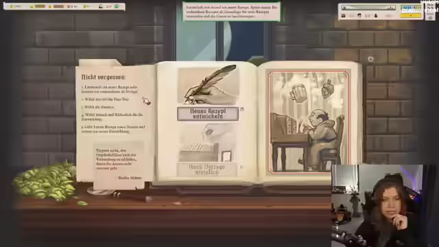 00:52:18Es wird der Start des Spiels 'Ale Abbey' angekündigt. Die Musik im Spiel wird als sehr gut empfunden. Es wird überlegt, ob die Pixel-Optik des Spiels beibehalten werden soll, aber entschieden, dass die normale Ansicht für den Stream besser lesbar ist. Die Abtei wird 'Zum heiligen Chat' genannt. Es folgt ein Tutorial, in dem erklärt wird, wie man die Spielgeschwindigkeit ändert. Der Bischof des Klosters stellt sich vor und kündigt an, die Fortschritte zu überwachen und Anweisungen zu geben. Um Gulden zu verdienen, muss Bier verkauft werden. Es soll ein leichtes Ale gebraut werden. In der Bibliothek soll ein Rezeptpult gefunden und das Rezept 'leichtes Ale' entwickelt werden. Das Rezept wird erstellt: Viermal helles Malz, zweimal Standardhefe. Agnes wird für die Entwicklung ausgewählt.