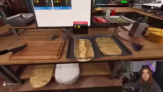 00:28:53Es wird das erste Mal der Restaurant-Simulator gespielt. Der Schwierigkeitsgrad wird auf normal eingestellt. Nach dem Start des Spiels werden Vorräte wie Hähnchen, Döner, Salat und Lavasch bestellt. Es wird erkundet, wie man die bestellten Zutaten platziert und den Döner zubereitet. Nach anfänglichen Schwierigkeiten mit der Steuerung und dem Platzieren der Zutaten wird der erste Döner zubereitet. Es wird erklärt, dass man durch das Abschließen von Bestellungen Erfahrungspunkte erhält und das Menü erweitert werden kann. Der erste Kunde, ein Hund, wird bedient, gefolgt von weiteren Kunden, die Döner mit Salat bestellen. Es gibt anfängliche Schwierigkeiten mit dem Servieren der Bestellungen, aber nach und nach wird der Ablauf verstanden. Es wird festgestellt, dass das Spiel nicht gut erklärt ist und man sich erst zurechtfinden muss.