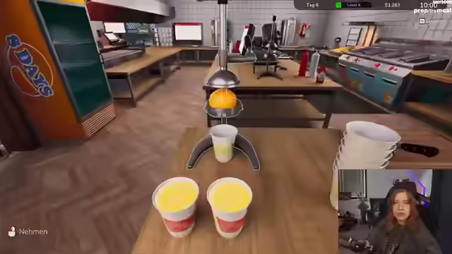 02:03:51Die Streamerin bereitet weitere Bestellungen zu, wobei es zu Fehlern kommt, wie z.B. das falsche Platzieren von Zutaten. Eine Bestellung wird zurückgenommen, da der Kunde sie nicht gegessen hat. Die Streamerin überlegt, ob sie den Orangensaft wiederverwenden kann. Sie bereitet Spieße mit Tomaten und Orangensaft zu und serviert sie an den Tischen. Es wird festgestellt, dass Orangensaft sehr beliebt ist. Die Streamerin bereitet weitere Zutaten vor, schneidet Gurken und Käse. Eine Bestellung mit Wrap und Gurken wird zubereitet. Die Streamerin stellt fest, dass eine Bestellung nicht korrekt ausgeführt wurde, was sonst nie passiert. Sie überlegt, ob sie die übrig gebliebenen Zutaten wiederverwenden kann. Die Streamerin überlegt, was sie selbst essen soll und entscheidet sich möglicherweise für einen Döner. Sie bereitet neue Zutaten vor, schneidet Essiggurken und Käse. Die Streamerin achtet darauf, dass alle Zutaten ordentlich weggepackt werden. Sie wird von einer Person von hinten überrascht, was sie mit einem Horror-Spiel vergleicht. Die Streamerin kündigt an, dass sie gleich beim Geocup von Bonjwa dabei sein wird.