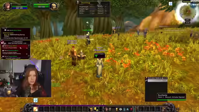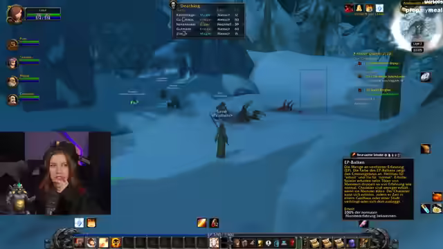 04:54:38Der Streamer levelt ihren Charakter weiter und erledigt Quests, wobei sie sich über die Faulheit freut, Essen bestellt zu haben. Es gibt Burger, Pommes und Barbecue. Sie nimmt Silberblatt mit und skillt ihren Charakter auf Level 10, wobei sie Disziplin als Spielweise wählt. Nach 4 Stunden und 38 Minuten Spielzeit sucht sie eine Gruppe für Hogger und findet schnell eine. Währenddessen spricht sie über Linsentopf und Leinenstoff, was sie gedanklich vermischt hat. Sie wartet kurz, um ihre Fertigkeiten zu verbessern und den Mob zu töten, um kein Risiko einzugehen. Die Streamerin levelt weiter und nimmt jedes bisschen Erfahrung mit, wobei sie auf den Respawn achtet. Sie konzentriert sich auf einzelne Gegner, um kein Risiko einzugehen und ihre Mana zu schonen. Sie erwähnt, dass sie vorbereitet war und Tränke dabei hat. Nach dem Essen schaut sie kurz und stellt fest, dass es sehr viel ist und sie noch Saucen hat. Währenddessen sterben Leute im Spiel, was sie kommentiert. Abschließend erwähnt sie, dass sie morgen wieder Training hat und es danach wegen eines Events nicht mehr sonnig sein wird.