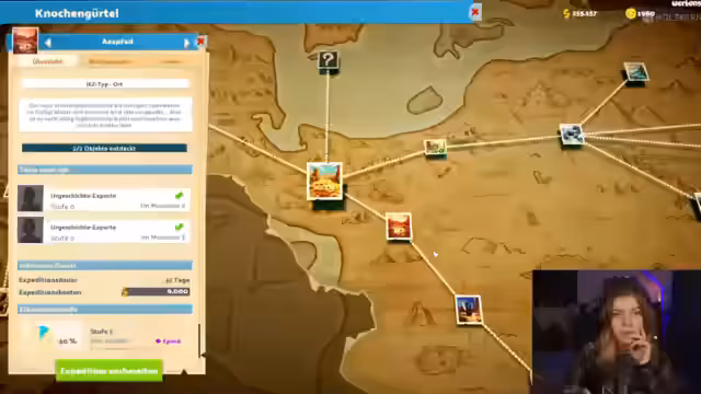 01:34:21Die Streamerin kehrt von einer Toilettenpause zurück und setzt das Spiel fort. Sie stellt fest, dass das negative Gekotze im Museum überhandnimmt und versucht, dies in den Griff zu bekommen. Es wird ein Money-Ding platziert, um mehr Einnahmen zu generieren. Die Streamerin startet eine Expedition mit Daniel, um einen Höhleneinsturz zu verhindern. Ein Expeditions-Dilemma tritt auf, bei dem Daniel konzentriert bleiben muss, um die Schädelspalte zu durchqueren. Das Expeditionsteam kehrt vom Knochengürtel zurück und schaltet die eisigen Minen frei. Es wird festgestellt, dass heilende Quellen benötigt werden, um die Krankheit der Mitarbeiter zu heilen. Eine weitere Expedition wird gestartet, um diese Quellen zu finden. Durch Follows und Subs können Booster für das Museum gekauft werden. Ein Mitarbeiter wird in Gastzufriedenheit ausgebildet.