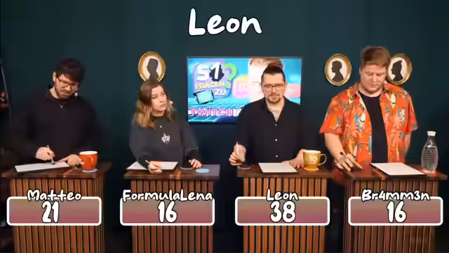03:47:25Die Fragen werden spezieller und behandeln Themen wie den größten Konkurrenten von Twitch (Own3d TV), das legendäre Twitch Plays Pokémon Event und das erste große E-Sport-Event auf Twitch (EVO 2011). Teilnehmer Leon zeigt sich als Experte für YouTube- und Twitch-Themen, während andere bei Schätzfragen komplett daneben liegen.