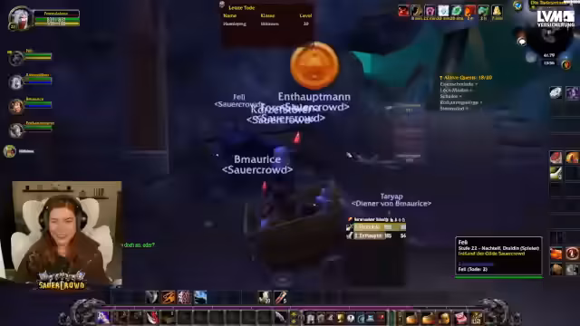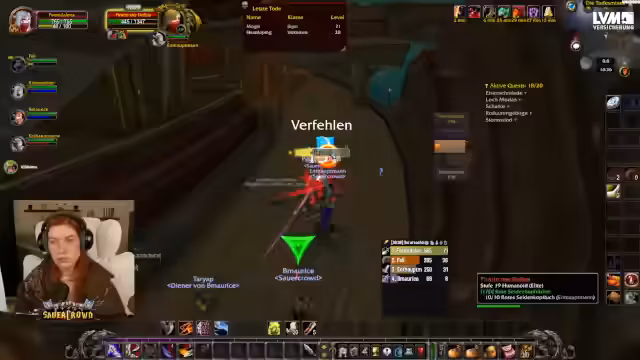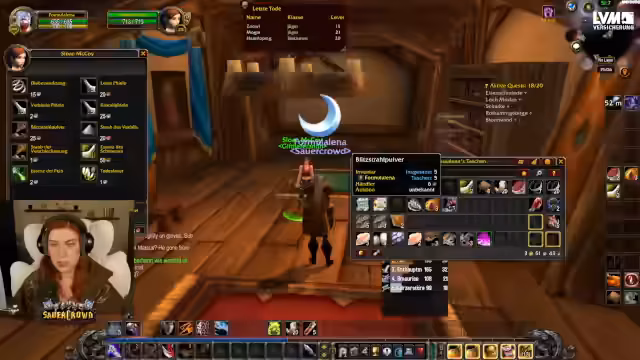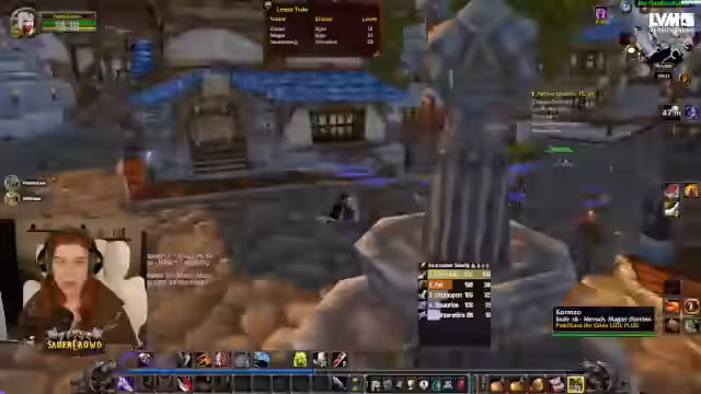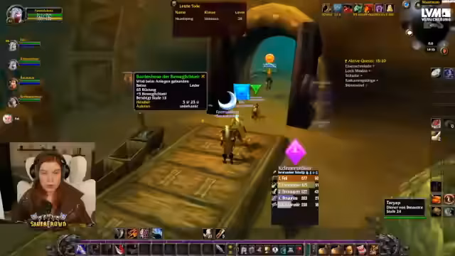04:49:26Die Streamerin hat für die Schurken-Quest einen Begleiter, Rayo, hinzugeholt. Gemeinsam infiltrieren sie den Turm der Defias. Sie durchkämpfen sich nach oben, wobei sie eine Elitegegnerin mithilfe eines Verwandlungszaubers unschädlich machen, um die Truhe plündern zu können. Nach erfolgreicher Questübergabe erhält Rayo einen Debuff, der ihn für sieben Tage tödlich bedroht, was die Wichtigkeit des Begleiters unterstreicht.