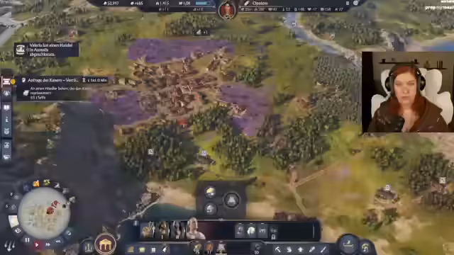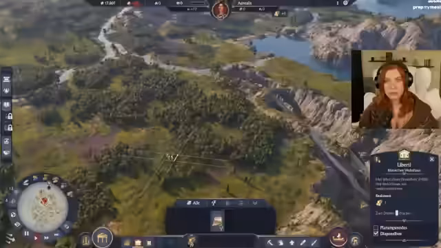 00:26:32Nach der Auswahl der Startinsel wird das Flaggschiff positioniert und mit dem Bau der ersten Strukturen begonnen. Zunächst werden Holzfäller an den Rand der Insel gesetzt, um den Wald zu schonen. Die Streamerin betont, dass sie sich von ihrem üblichen effizienten Baustil lösen will und experimentierfreudiger vorgehen möchte, was den Aufbau zunächst etwas schwierig macht. Die Siedlung entlang des Flusses geplant, mit dem Ziel, sowohl Wohngebäude als auch Produktionsanlagen zu platzieren und dabei auf eine ansprechende Gestaltung zu achten.