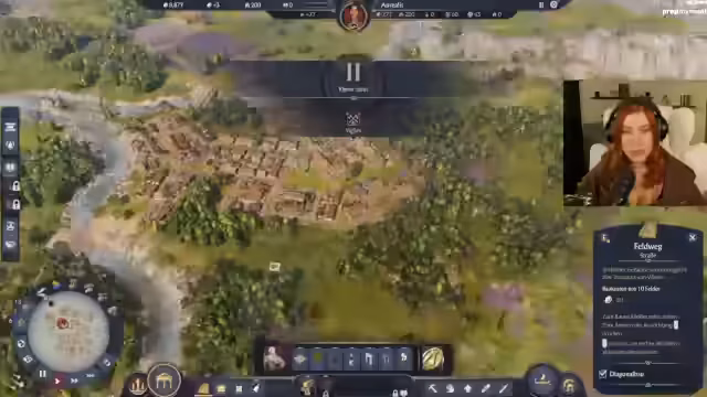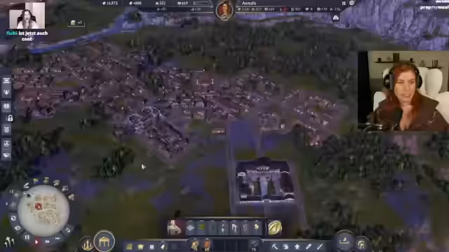 00:45:09Der Fokus verlagert sich auf die Gestaltung des städtischen Kernbereichs. Wege werden nicht mehr im klassischen Raster, sondern organisch und geschwungen angelegt, um der Stadt ein einzigartiges Aussehen zu verleihen. Währenddessen entstehen erste Herausforderungen, als die Bewohner mehr Güter fordern. Es werden eine Markthalle und erste Produktionsgebäude wie eine Fischerhütte und später ein Garum-Produzent errichtet. Die Streamerin experimentiert mit der Platzierung von Dekorationsobjekten und stößt auf die mechanische Einschränkung, dass nur bestimmte Bereiche mit Objekten gefüllt werden können.