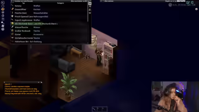 08:46:19Die Spielerin erklärt den Zuschauern, dass sie Base-Building betreibt und seit kurzem fließendes Wasser hat. Sie zeigt ihre bemalten Schuhe und bedankt sich für die Unterstützung. Es wird überlegt, die Digitaluhren auseinanderzubauen, um Elektrotechnik zu skillen, benötigt dafür aber einen Lötkolben und eine Schweißermaske. Die VHS 'Carzone' wird gefunden und soll zum Skillen genutzt werden. Die Spielerin sortiert ihr Inventar und plant, die VHS anzusehen. Sie zerlegt Digitaluhren, um Elektrotechnik zu skillen, was jedoch sehr lange dauert. Sobald es hell ist, möchte sie losziehen und in Rosewood Fernseher kaputt machen, um weiter zu skillen. Sie erklärt, dass es nachts unangenehmer ist, da man weniger sieht und das Auto ständig ausgeht. Das Ziel ist, ein neues Auto zu finden, um wieder durch die Gegend düsen zu können. Es wird Kfz-Bahn 2 gelesen, um den Kfz-Skill zu verbessern.