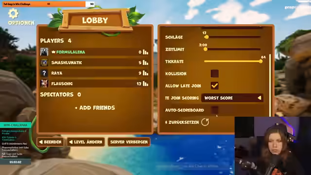05:47:10Im Verlauf des Streams werden die Nerven bei der Win-Challenge immer dünner. Es wird eine mögliche Wechselzeit zu Phasmophobia ins Auge gefasst, man entscheidet sich jedoch, die Challenge zunächst fortzusetzen. Die Streamerin betont, dass bei den Mini-Löchern am Ende viel aufgeholt werden kann, wenn man ruhig bleibt. Die Spannung steigt, als die Spieler in den letzten Lochs versuchen, ihre Schlagleistung zu maximieren, um die Challenge zu meistern. Die Anspannung ist greifbar, da der Druck auf die Spieler, insbesondere auf Lena, immens ist.
