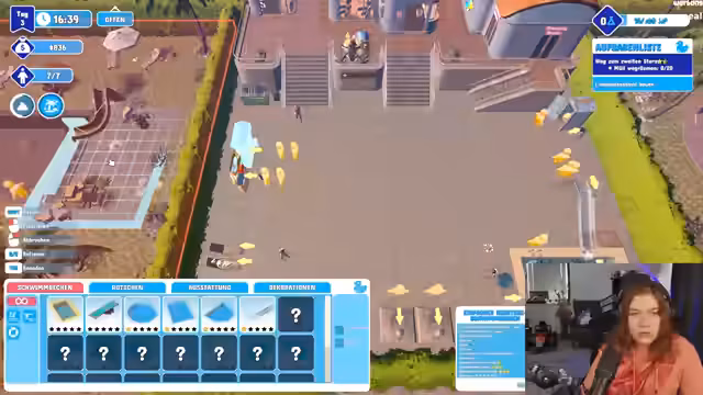 02:17:42Nach dem Reaction-Video startete die Streamerin den "Aquapark Simulator". Nach anfänglichen Schwierigkeiten mit den Einstellungen und der Namensfindung für den Park, der schließlich "Atlantiker" genannt wurde, begann sie mit dem Spiel. Ziel ist es, einen alten, verlassenen Wasserpark wieder aufzubauen und zu neuem Glanz zu verhelfen. Zunächst musste der Eingangsbereich von Müll und Unrat befreit werden. Die Streamerin hatte einige Schwierigkeiten mit der Steuerung und den Aufgaben, wie dem Aufsammeln von Müll und dem Füllen des Schwimmbeckens. Trotz anfänglicher Schwierigkeiten und kleinerer Rückschläge, wie einem geplatzten Müllsack, arbeitete sie daran, den Park für die ersten Besucher vorzubereiten. Es wurden erste Attraktionen wie ein Sprungbrett platziert und der Park für die Öffentlichkeit freigegeben.
