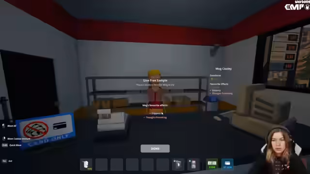 01:49:18Nachdem die Grundstruktur des Labors geschaffen ist, begibt sich die Streamerin auf die Suche nach notwendigen Zutaten und Ausrüstung. Sie kauft eine große Menge an Regalen, Müllsäcken und weitere Geräte, um ihre Produktionsstätten zu komplettieren. Dabei muss sie feststellen, dass ihr Geld knapp wird und sie vor dem nächsten Einkauf Geld abheben muss, da sie nicht genug Bargeld für alle notwendigen Materialien hat.