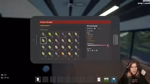 00:10:20Nach technischen Vorbereitungen geht es um den Drogenhandel. Die Streamerin stellt fest, dass der Vorrat an Drogen fast aufgebraucht ist und sie bei ihrem Händler des Vertrauens nachbestellen muss. Sie beginnt damit, neue Drogen zu mischen und herzustellen, wobei sie die Zutaten wie Viagra, Donuts und Bananen kombiniert. Ziel ist es, neue, profitablere und süchtig machende Produkte zu schaffen, die ihr Händler Benji verkaufen kann. Die Prozesse der Ernte, Mischung und Verpackung werden detailliert gezeigt.