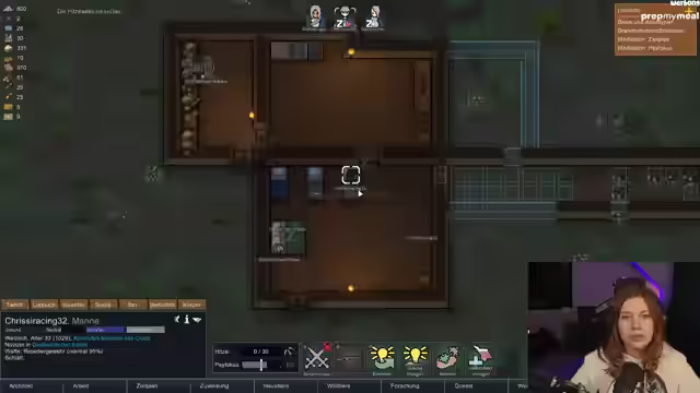 03:47:26Die Kolonie kämpft mit Verletzungen und Ressourcenmangel. Es gibt Schwierigkeiten bei der medizinischen Versorgung und der Nahrungsbeschaffung. Chrissy, ein wichtiger Charakter, wird verletzt und muss gerettet werden. Es schließen sich zufällig Rinder an, was die Situation zusätzlich verkompliziert. Es wird versucht, die Kolonie zu stabilisieren, indem verwundete Charaktere versorgt, Medizin hergestellt und Nahrung beschafft wird. Die Ressourcenknappheit zwingt zu effizientem Wirtschaften und Priorisierung. Ein Händler exotischer Güter trifft ein, was neue Möglichkeiten eröffnet. Es werden Kühe eingefangen und Anbauzonen für Heugras eingerichtet, um die Nahrungsversorgung zu sichern. Es wird eine Quest verfügbar, die jedoch aufgrund der Verletzungen der Kolonisten zunächst abgelehnt wird. Es wird eine Nahrungskammer eingerichtet, um die Lagerung zu optimieren. Chrissy erholt sich und geht wieder auf die Jagd. Eine Hitzewelle zwingt zum Bau passiver Kühlvorrichtungen. Eine Quest wird angenommen, bei der ein Meerschweinchen gejagt werden muss. Patronia tritt der Kolonie bei, aber es kommt zu einem Kampf mit einem Meerschweinchen, bei dem Chrissy erneut verletzt wird.