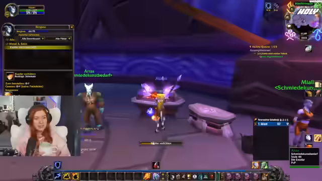 00:22:59Zurück im Spiel widmet sich die Streamerin ihren Berufen, insbesondere der Juwelierkunst. Es werden die ersten Skillpunkte eingefahren und Materialien gesammelt. Währenddessen unterhält sie sich über das Thema Mounts und gibt ihre Vorlieben bekannt: Nachtelfen-Tiger als beste Mounts und Gnomen-Roboter als die schlimmsten. Im Inventar staut sich der ganze Chat auf, was dazu führt, dass die Streamerin sich gezwungen sieht, Gegenstände zu verkaufen, um Platz zu schaffen.