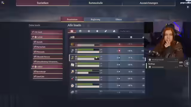 05:26:52Die Kaiserin meldet sich mit einer Angelegenheit von enormer Wichtigkeit: Die kaiserliche Geldkasse ist leer. Die Streamerin beschließt, eine beeindruckende Summe zu spenden, da der Ruf bei der Kaiserin bereits sehr hoch ist. Anschließend wird der Fokus auf Albion verlagert, wo die Ältesten glücklich sind und die Weinproduktion gut läuft. Um die nächste Stufe freizuschalten, müssen weitere Älteste gewonnen werden, was einen weiteren Ausbau der Insel erfordert. Es gibt Anzeichen für öffentliche Unruhen, die jedoch durch den Bau weiterer öffentlicher Gebäude wie Sängerstuben behoben werden sollen, um die Zufriedenheit der Bewohner zu gewährleisten.