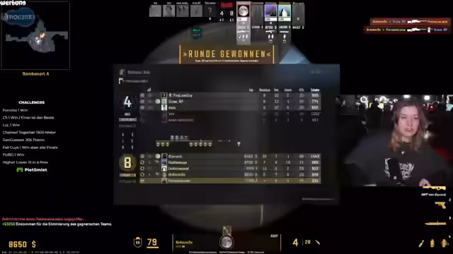 04:04:26Die Gruppe beginnt die letzte Runde im Spiel. Die Streamer nimmt eine AUG und hat ein klares Ziel: gewinnen. Obwohl die Map-Anforderungen unklar sind, besteht die Gruppe darauf, durchzuhalten. Nach einigen intensiven Momenten und strategischen Entscheidungen gelingt es der Gruppe, die Runde zu gewinnen. Die Streamer zeigt sich begeistert und lobt die Teamleistung, besonders nachdem sie alleine B verteidigen musste.