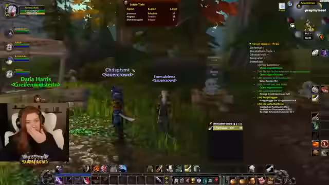 02:22:32Die Streamerin unterhält sich über die aktuelle Spielumgebung. Es fällt ihr auf, dass sich wenige Spieler in ihrem Levelbereich aufhalten, weshalb sie gezielt sucht, wer für Instanzen bereit ist. Sie entscheidet, eine Questreihe in Westfall fortzusetzen, wo sie mit anderen Spielern zusammenarbeitet. Dabei spricht sie über den Dunkelmond-Jahrmarkt, den sie besucht, um einen speziellen Buff und Belohnungen wie die Robben-Gestalt zu erhalten. Die Quest wird als einfach und straightforward beschrieben.