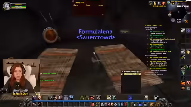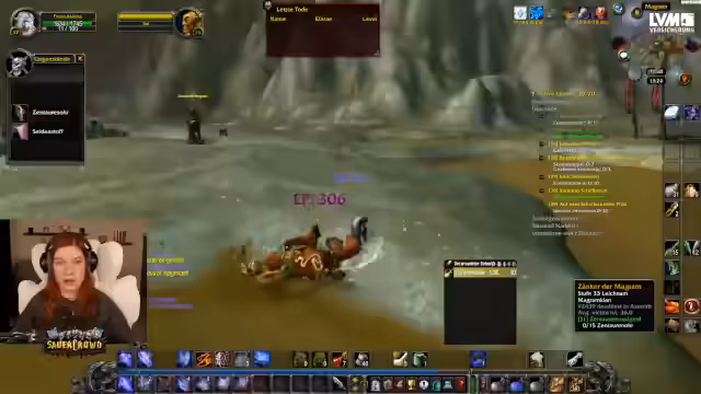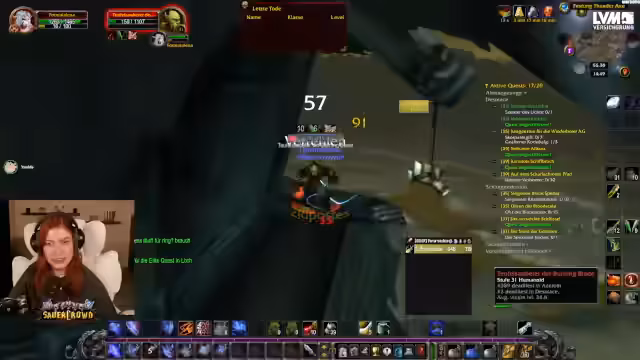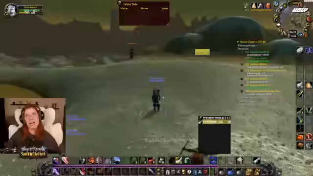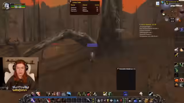 05:13:33Die Streamerin schließt ihre Quests in Ashenvale erfolgreich ab und wird von Holla begleitet. Sie plant, sich auf dem Weg zu einem anderen Flugpunkt zu begeben, als ihr Inventar vollläuft und sie erst Platz schaffen muss. Sie entscheidet, für den Tag fertig zu sein und gibt die Gründe für ihre kürzere Stream-Länge an, wie z.B. Kopfschmerzen und einen wichtigen Termin am nächsten Tag. Zum Abschied wünscht sie ihren Zuschauern viel Erfolg beim Questen und warnt sie davor, Sterbe-Clips zu machen. Sie verabschiedet sich und sendet die Zuschauer zu einem anderen Streamer, Anna.