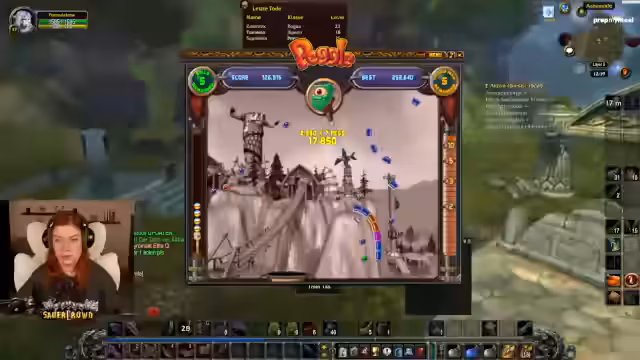 04:50:16Während ihrer Erkundung in Ashenvale sammelt die Streamerin Kräuter, stößt jedoch auf Schwierigkeiten, da die Gebiete nicht ideal für ihr Kräuterlevel sind. Das Sammeln ist zeitaufwändig und frustrierend, da sie ständig zwischen Gebieten wechseln muss, um sinnvolle Beute zu finden. Parallel dazu spielt sie das Spiel Peggle, bei dem sie einen sehr hohen Score von 421.000 erreicht und sich freut, dies der Gilde präsentieren zu können. Sie erwähnt, dass sie auch aktiv WoW spielt, wenn sie fliegt, und zeigt den Chat ihr Gameplay.