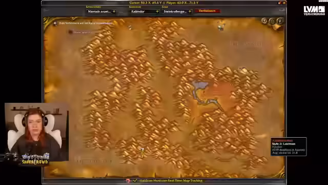 01:35:49Die Streamerin orientiert sich im unwegsamen Aschental und Steinkrallengebirge, wobei sie sich für den querfeldein Weg entscheidet, da der offizielle Pfad unklar ist. Sie äußert ihre Abneigung gegen das Desolace-Gebiet und findet die Optik deprimierend. Nach einem langen Fußmarsch erreicht sie schließlich Desolace und findet mehrere grüne Quests, die sie als lohnenswert für den Fortschritt ansieht, einschließlich der Quest für das Kloster.