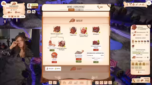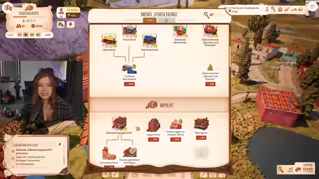 03:11:30Die Bedeutung der Dekoration zur Steigerung der Zufriedenheit der Einwohner wird hervorgehoben. Bäume, Parkbänke und ein Brunnen werden platziert, um die Umgebung zu verschönern. Die Streamerin erklärt, dass eine hohe Zufriedenheit (mindestens 60%) erforderlich ist, damit neue Einwohner in die Stadt ziehen. Ein Forschungszentrum wird außerhalb des Stadtzentrums gebaut, um Forschungspunkte zu generieren. Ein Fischstand wird auf dem Markt errichtet, und die Möglichkeit, Gebäude zu dekorieren, wird entdeckt. Die Streamerin ist begeistert von den vielfältigen Dekorationsmöglichkeiten und beginnt, die Stadt mit Blumen und anderen Verzierungen zu verschönern. Die Chat-Integration wird genutzt, um die Stadt in 'Chathausen' umzubenennen und die Namen der Chat-Teilnehmer in das Spiel zu integrieren.