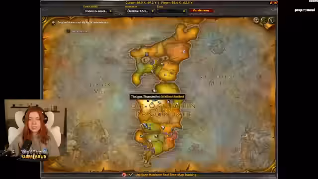 01:57:19Zunächst wird die Quest-Hierarchie für Feralas geplant. Die Gruppe beschließt, zuerst die Quests im oberen Bereich zu erledigen und anschließend nach unten zu fighten, um am Ende wieder am Startpunkt zu sein. Die Spinnen-Quest wird für später in Betracht gezogen. Bei Helenia Olden wird geklärt, dass Gronkh bereits abgegeben wurde. Die Route führt nun über Fährerlass, um den Weg durch das Brachland zu nehmen und Zeit zu sparen. Der Mount von Vader fehlt noch, daher plant die Gruppe, darauf zu warten.