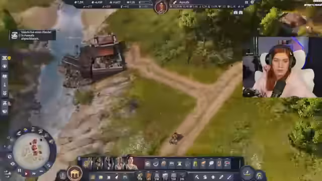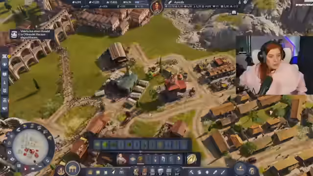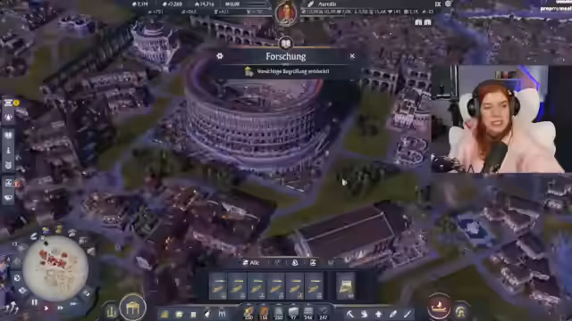00:29:30Nach persönlichen Anekdoten und einem kurzen Plausch mit dem Chat geht es zurück in das Spiel Anno 117. Die Stadt rund um das Kolosseum wird weiter ausgebaut. Fokus liegt auf der Produktion von Fiebeln, der Beschaffung von Amphoren für eine Quest und der Verbesserung der Infrastruktur mit Brunnen und Latrinen. Die Gladiatoren-Spiele laufen, und der Ruf der Insel steigt.