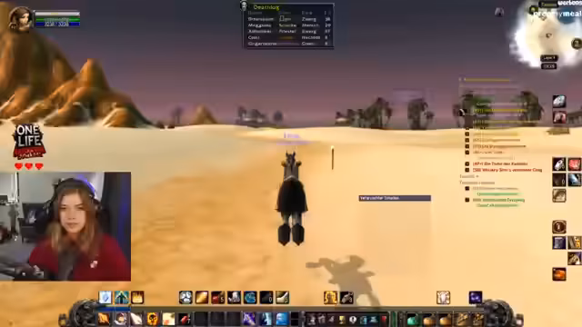 01:27:26Die Streamerin macht sich einen Kaffee-Chat, um anschließend gemeinsam mit Chatmitgliedern Items zu farmen. Sie erkundert das Gebiet Tausend Nadeln und bittet die Chatmitglieder, während der Reise oder Wartezeiten bei Dungeons kleine Spiele wie Peggle zu spielen. Gemeinsam mit dem Chatmitglied Yuga plant sie, das Gebiet Schlingendorntal zu questen und Flugpunkte zu sichern. Die Challenge verläuft bisher sehr erfolgreich, da der Streamercharakter noch nicht gestorben ist und momentan Level 42 erreicht hat.